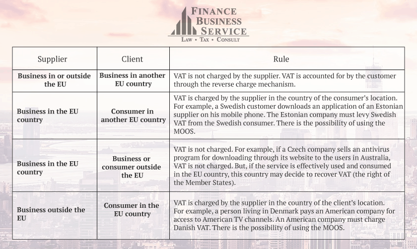 So, the essence of the legislative requirements for levying VAT from electronic, telecommunications, and television and radio broadcasting services is to ensure the suppliers to pay VAT for such services in each EU country in which they provide them. It may lead for many companies to a legal requirement to register VAT by the payers separately in each EU country where they have clients. This is the reason why the MOSS system has been created, by which the declaration and payment of VAT on several European countries can be made through a single electronic declaration submitted to the local tax authority.