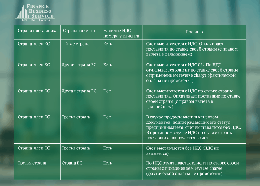 По общему правилу предоставление услуг B2B облагается налогом по месту нахождения клиента. При этом клиент обязательно должен предоставить поставщику услуг свой НДС номер, иначе такая сделка рассматривается как B2C. Если же клиент является резидентом третьей страны (не страны-члена ЕС) и не имеет европейского номера НДС, для его рассмотрения как бизнес-клиента он должен предоставить документы, подтверждающие ведение им хозяйственной и предпринимательской деятельности.