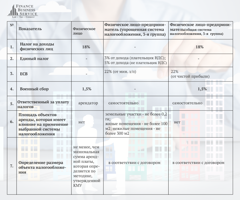 Сравнительная таблица налогообложения при сдаче объектов недвижимости физическим лицом и физическим лицом-предпринимателем