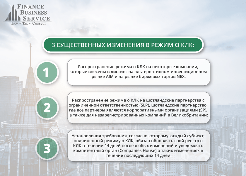 В апреле прошлого года Правительство Великобритании внесло ряд изменений в Закон о Компаниях 2006 года, в соответствии с которыми большинство компаний и партнёрств с ограниченной ответственностью (далее SLP) должны составлять, хранить и вести реестр физических или соответствующих юридических лиц, которые являются контролирующими лицами в компании или SLP (в основном на основании обладания более 25% акций, права голоса или иным образом имеющие право осуществлять значительный контроль). Кроме того, по словам правительства, указанные изменения должны были повысить прозрачность действий контролирующих лиц в компаниях и SLP Великобритании.