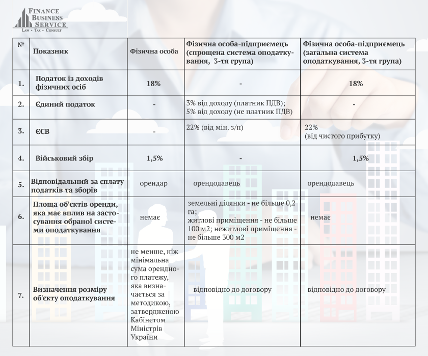 Порівняльна таблиця оподаткування при здачі об’єктів нерухомості фізичною особою та фізичною особою-підприємцем