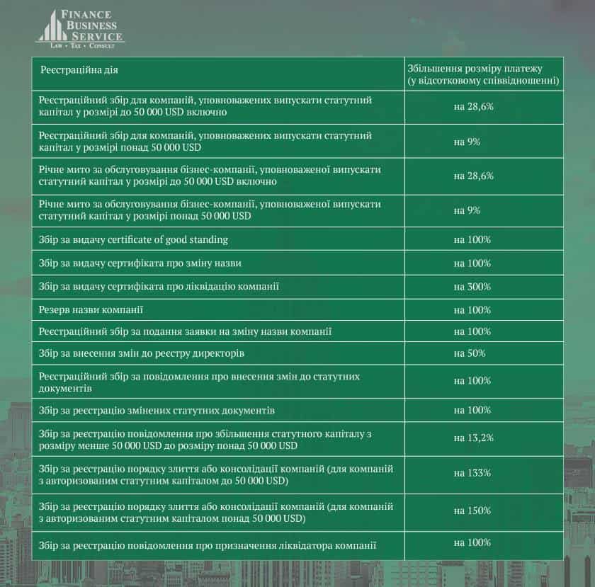 Відповідно, збільшилися і штрафи за невчасну сплату річних внесків, оскільки вони встановлені у відсотковому співвідношенні від розміру річного мита. Значно збільшено також розмір оплати за відновлення компанії в Реєстрі.